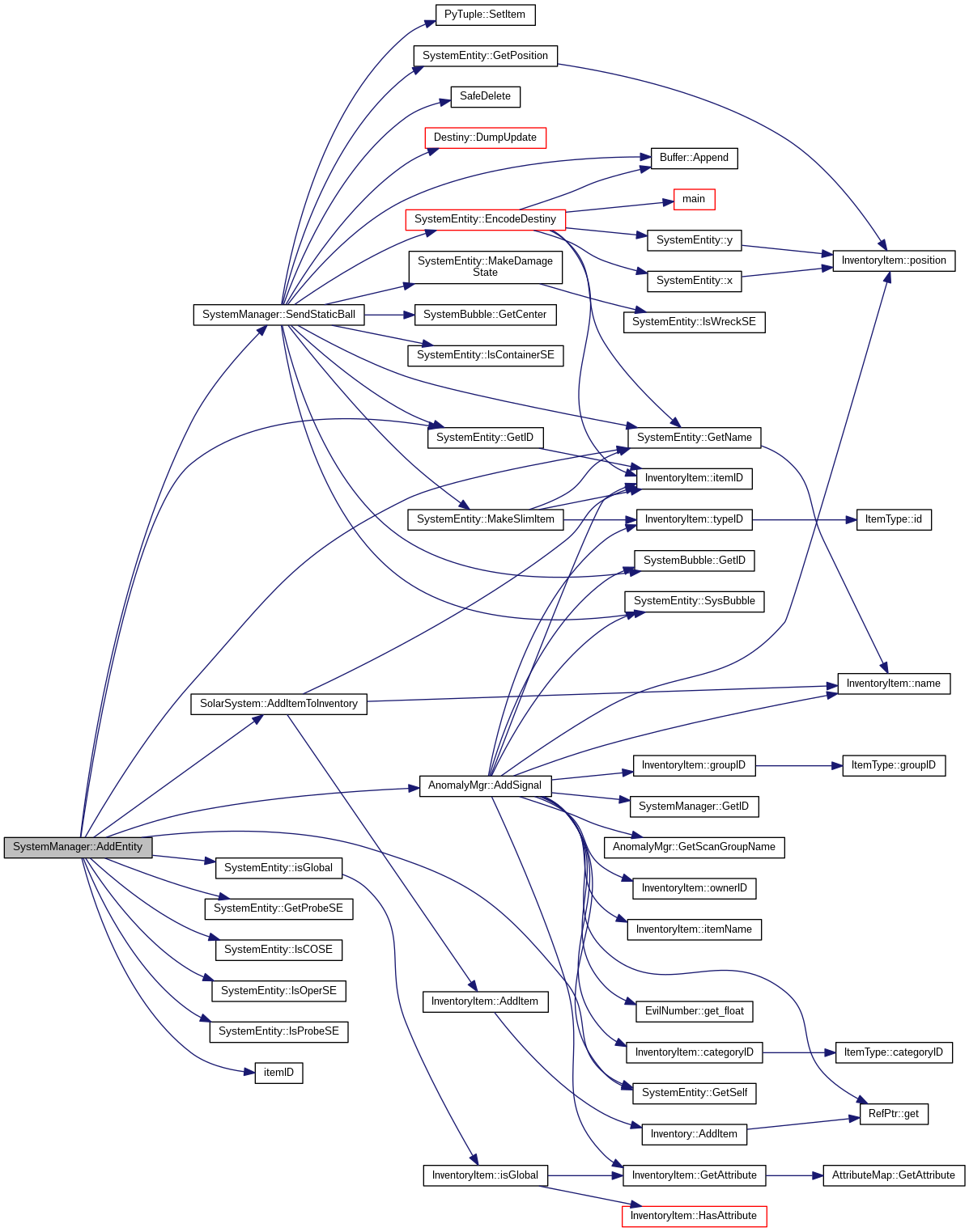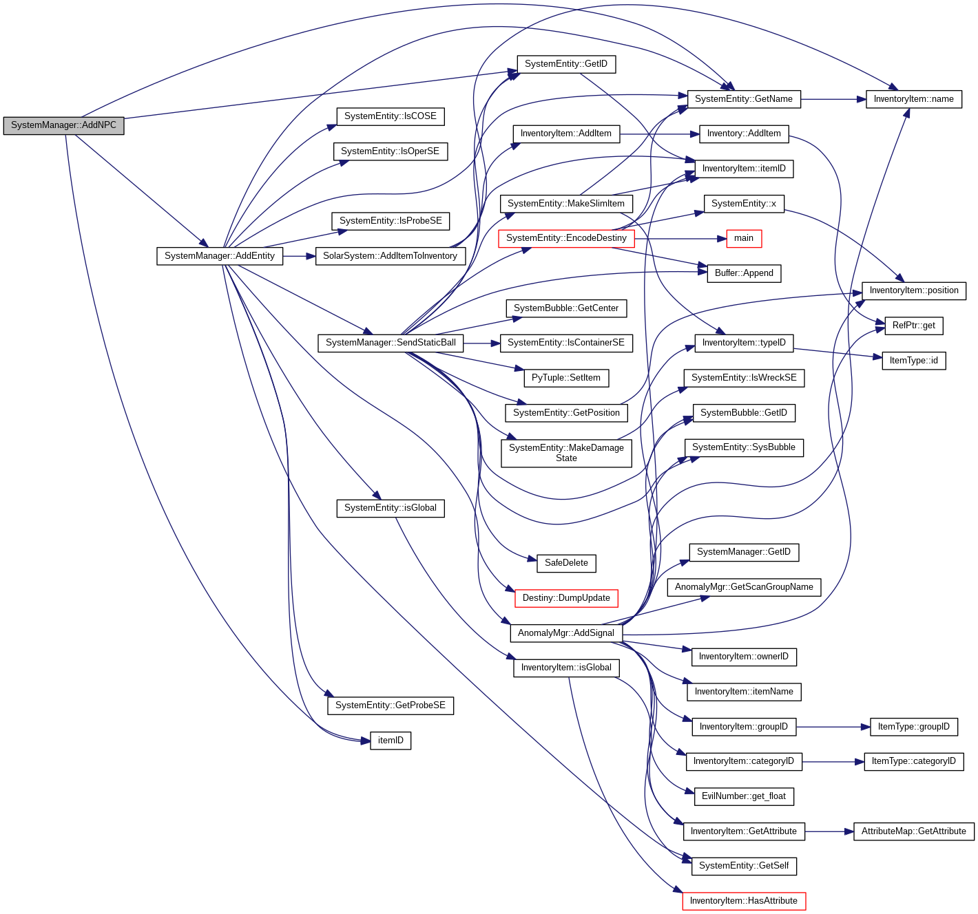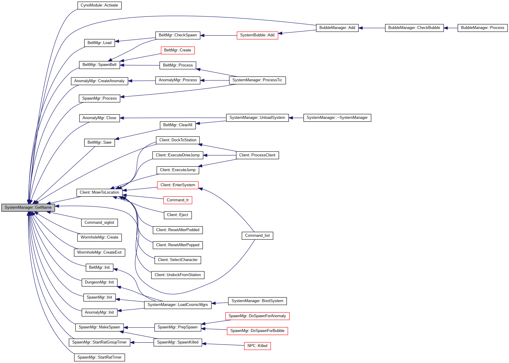 Referenced by AddBounty(), AddClient(), AddEntity(), AddNPC(), BootSystem(), BuildDynamicEntity(), DoSpawnForBubble(), GetAllEntities(), GetConstellationID(), GetID(), GetName(), GetNameStr(), GetRegionID(), GetSpawnBubbles(), GetSystemSecurityClass(), GetSystemSecurityRating(), LoadCosmicMgrs(), LoadPlayerDynamics(), LoadSystemDynamics(), LoadSystemStatics(), MakeSetState(), ManipulateTimeData(), PayBounties(), RemoveClient(), RemoveItemFromInventory(), RemoveNPC(), RemoveSpawnBubble(), SetDockCount(), SystemManager(), UnloadSystem(), UpdateData(), and ~SystemManager().