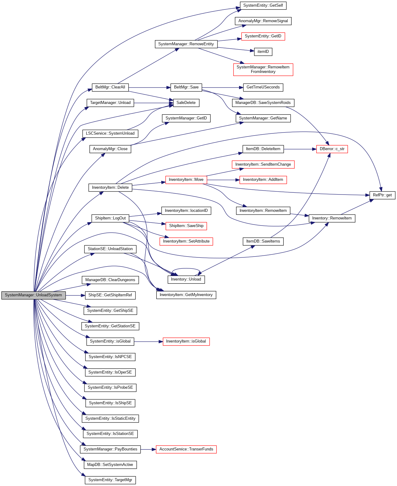 References _log, BeltMgr::ClearAll(), ManagerDB::ClearDungeons(), AnomalyMgr::Close(), SystemData::constellationID, InventoryItem::Delete(), InventoryItem::GetMyInventory(), SystemEntity::GetSelf(), ShipSE::GetShipItemRef(), SystemEntity::GetShipSE(), SystemEntity::GetStationSE(), SystemEntity::isGlobal(), SystemEntity::IsNPCSE(), SystemEntity::IsOperSE(), SystemEntity::IsProbeSE(), SystemEntity::IsShipSE(), SystemEntity::IsStaticEntity(), SystemEntity::IsStationSE(), ShipItem::LogOut(), PyServiceMgr::lsc_service, m_anomMgr, m_beltMgr, m_data, m_entities, m_loaded, m_npcs, m_opStaticEntities, m_services, m_solarSystemRef, m_staticEntities, m_ticEntities, SystemData::name, PayBounties(), SystemData::regionID, SafeDelete(), sBubbleMgr, sEntityList, MapDB::SetSystemActive(), sItemFactory, sLog, SystemData::systemID, LSCService::SystemUnload(), SystemEntity::TargetMgr(), Inventory::Unload(), TargetManager::Unload(), and StationSE::UnloadStation().